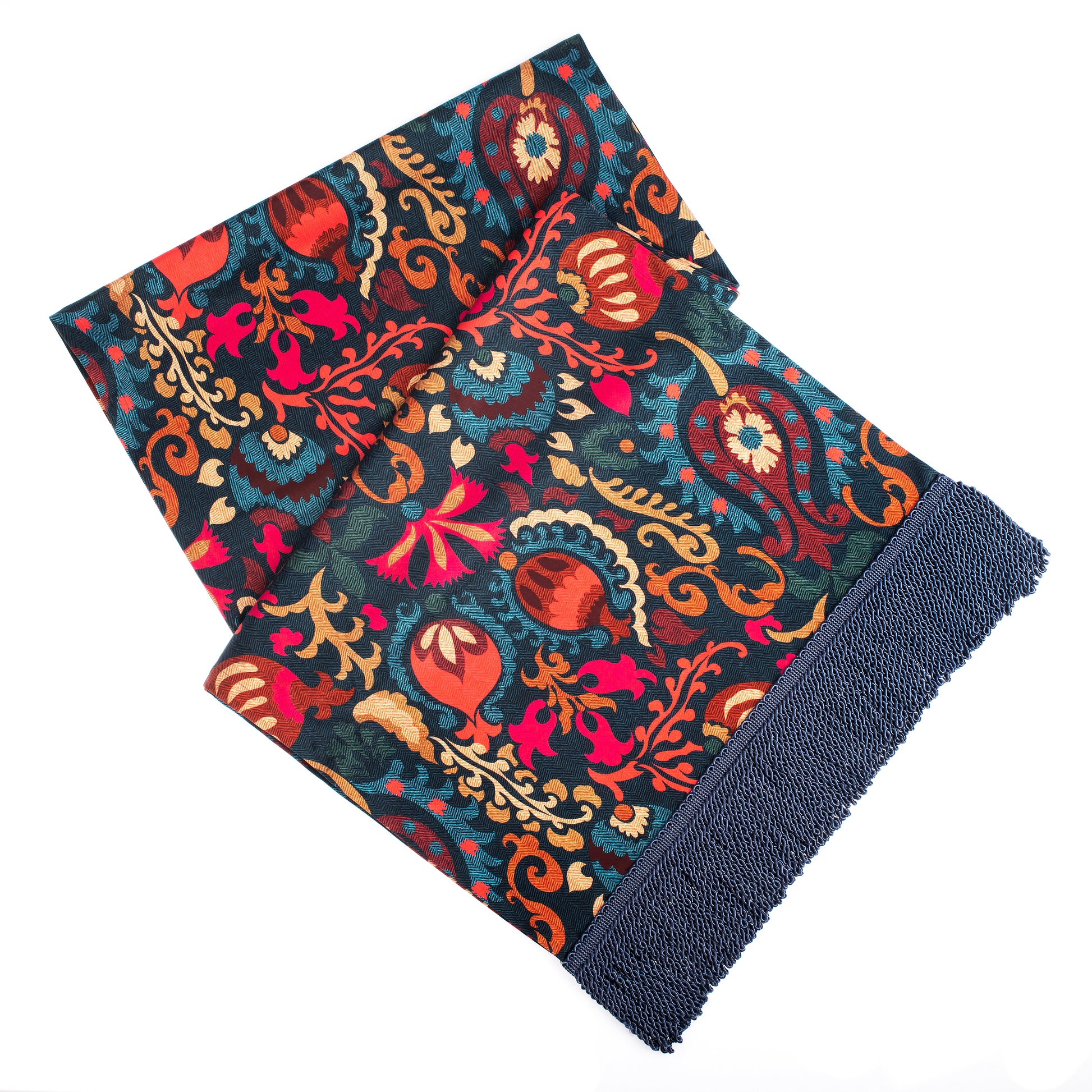 Set against a rich navy-blue background, this pillow features a charming array of tulips and pomegranates. The deep color enhances the vivid, floral and fruit motifs, creating a sophisticated yet vibrant look. It’s ideal for adding a touch of refined elegance and botanical beauty to your decor.