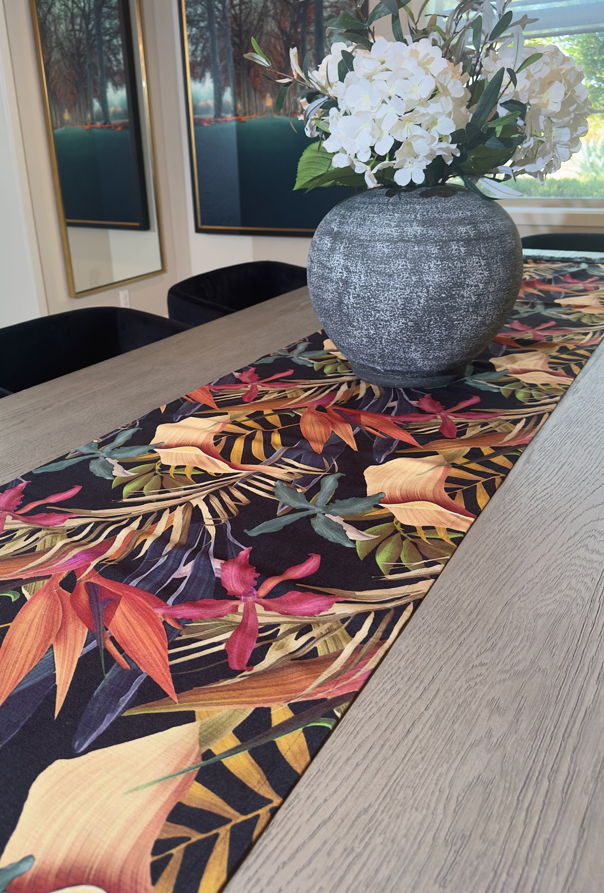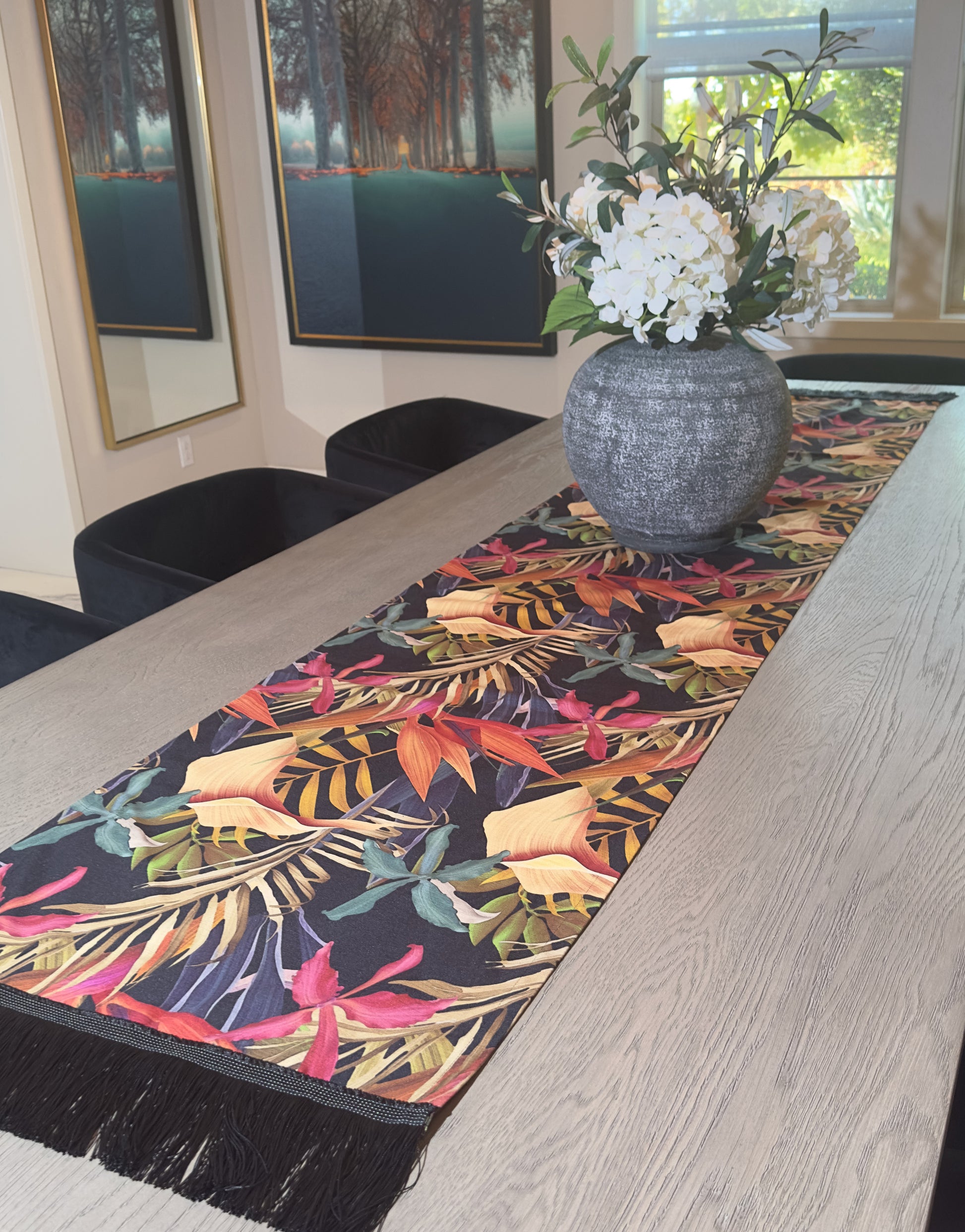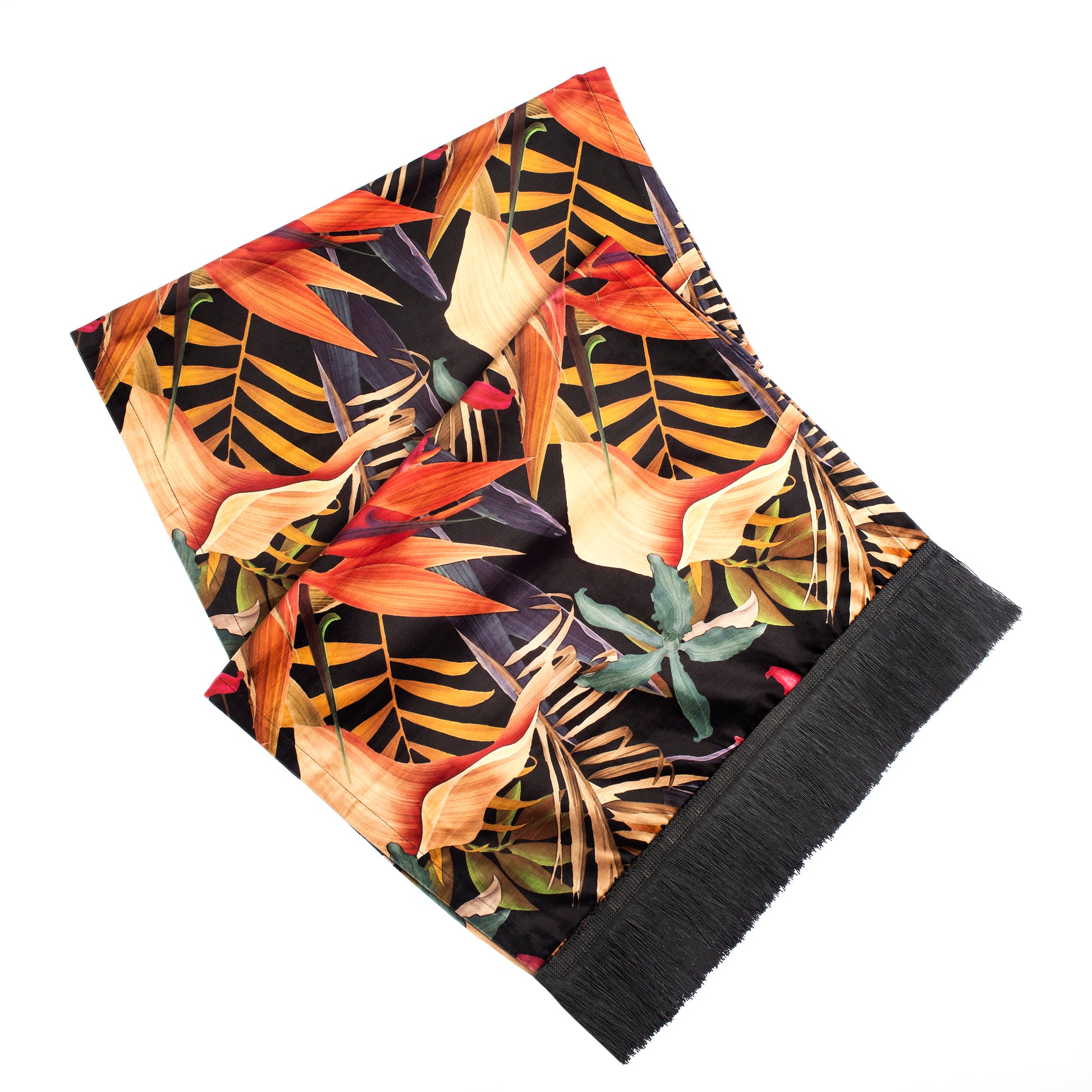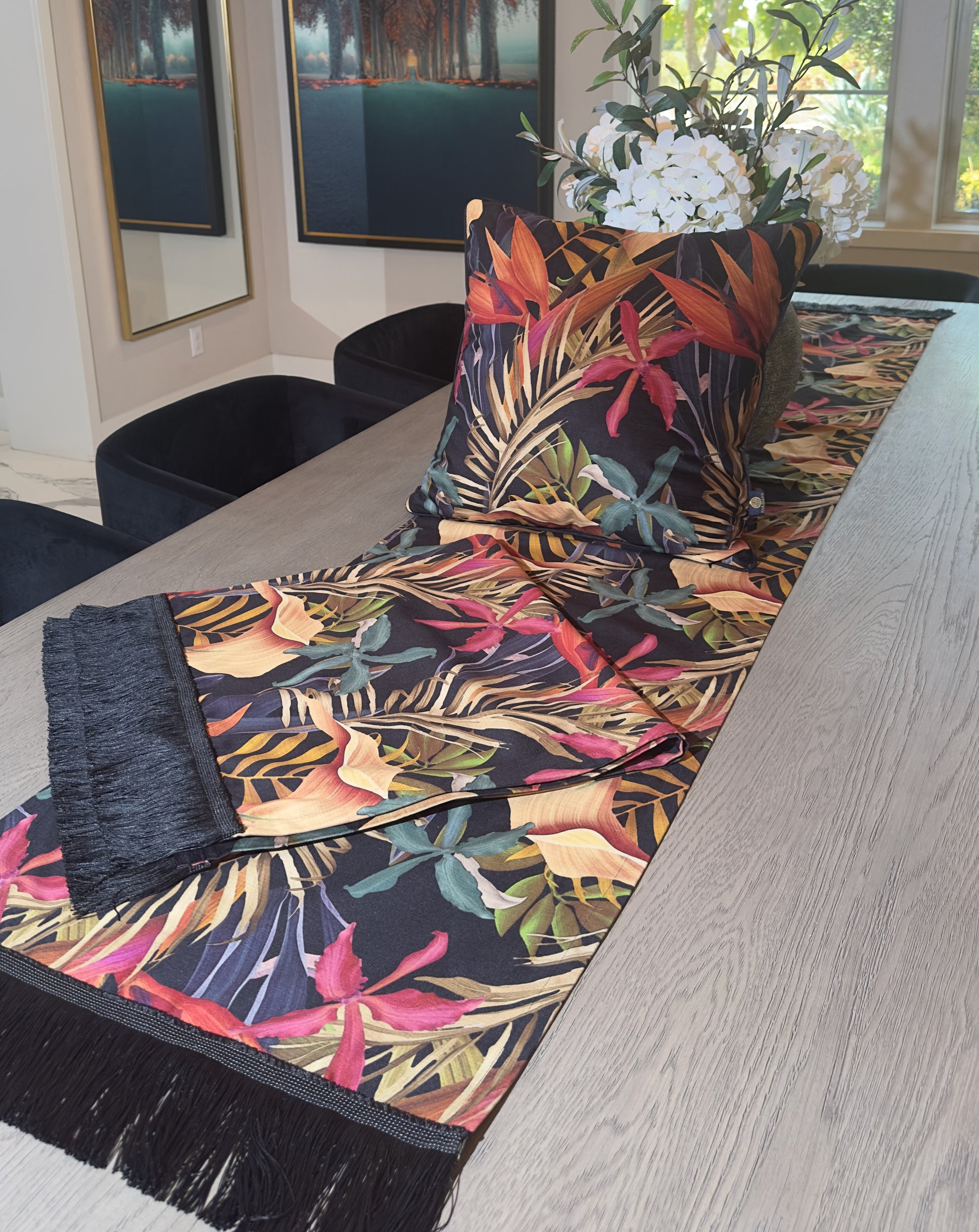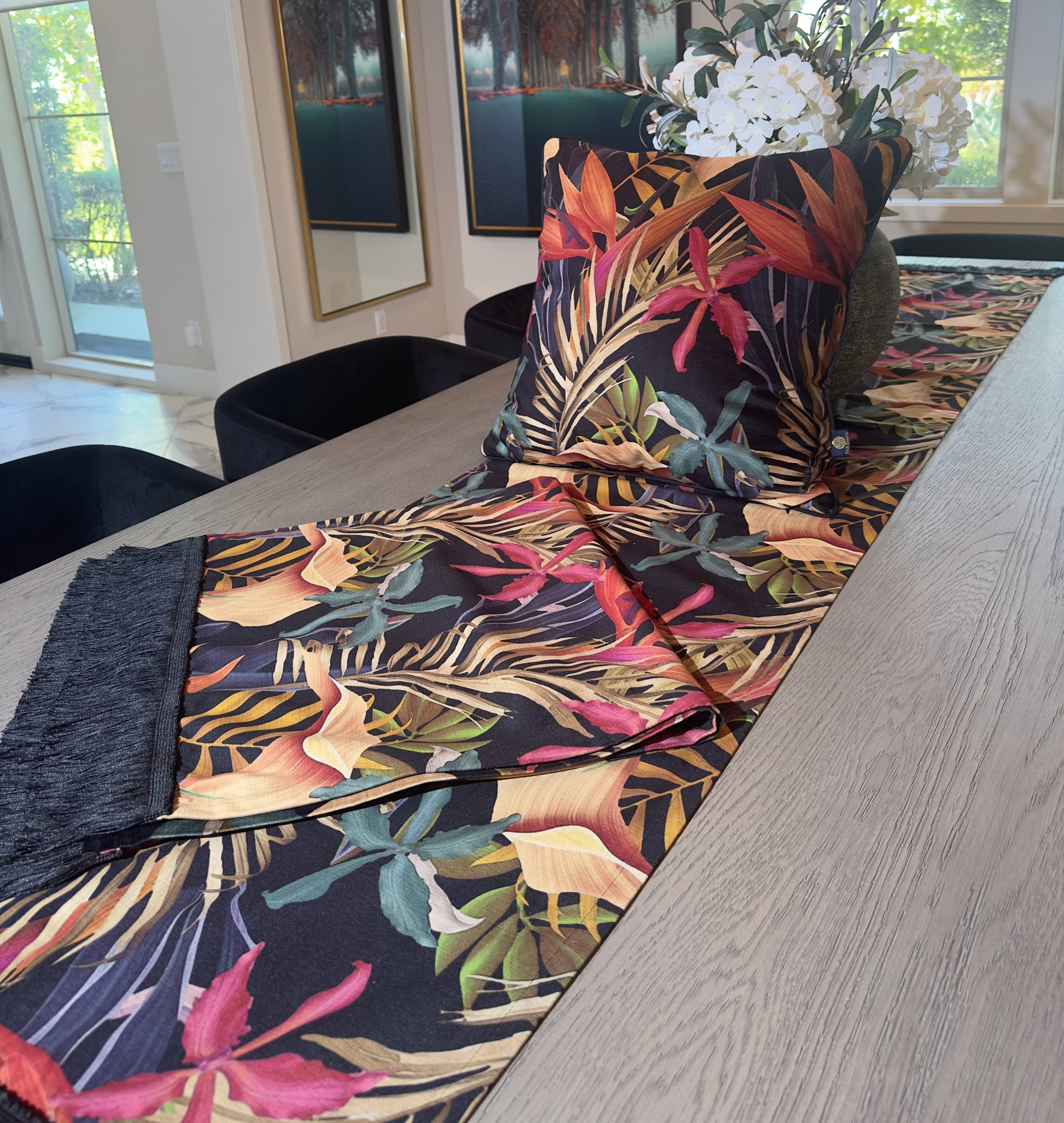 Against a deep black background, this pillow showcases vibrant Bird of Paradise flowers and lush, palm-like plants. The dark backdrop makes the tropical elements pop, creating a striking and sophisticated design. Ideal for adding an exotic and bold touch to your decor.