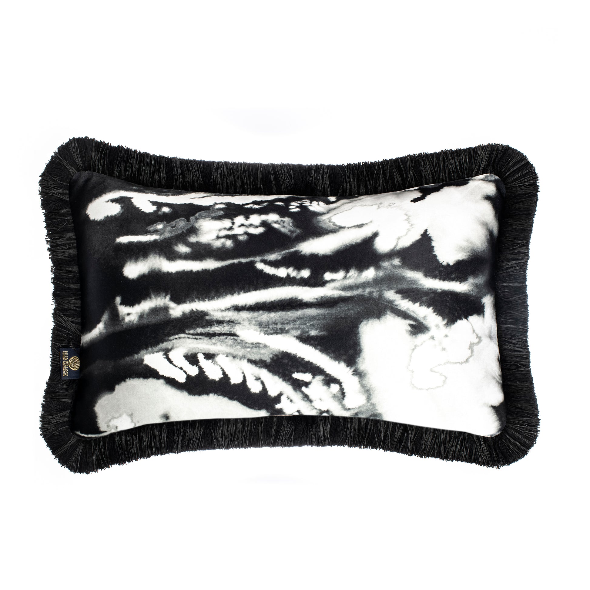 Set against a deep black background, this pillow cover features an abstract white watercolor pattern, creating a dynamic and stylish contrast. Made from luxurious vegan silk, it combines a sleek, soft texture with eco-friendly materials. A perfect choice for adding a touch of contemporary elegance and artistic flair to any space.