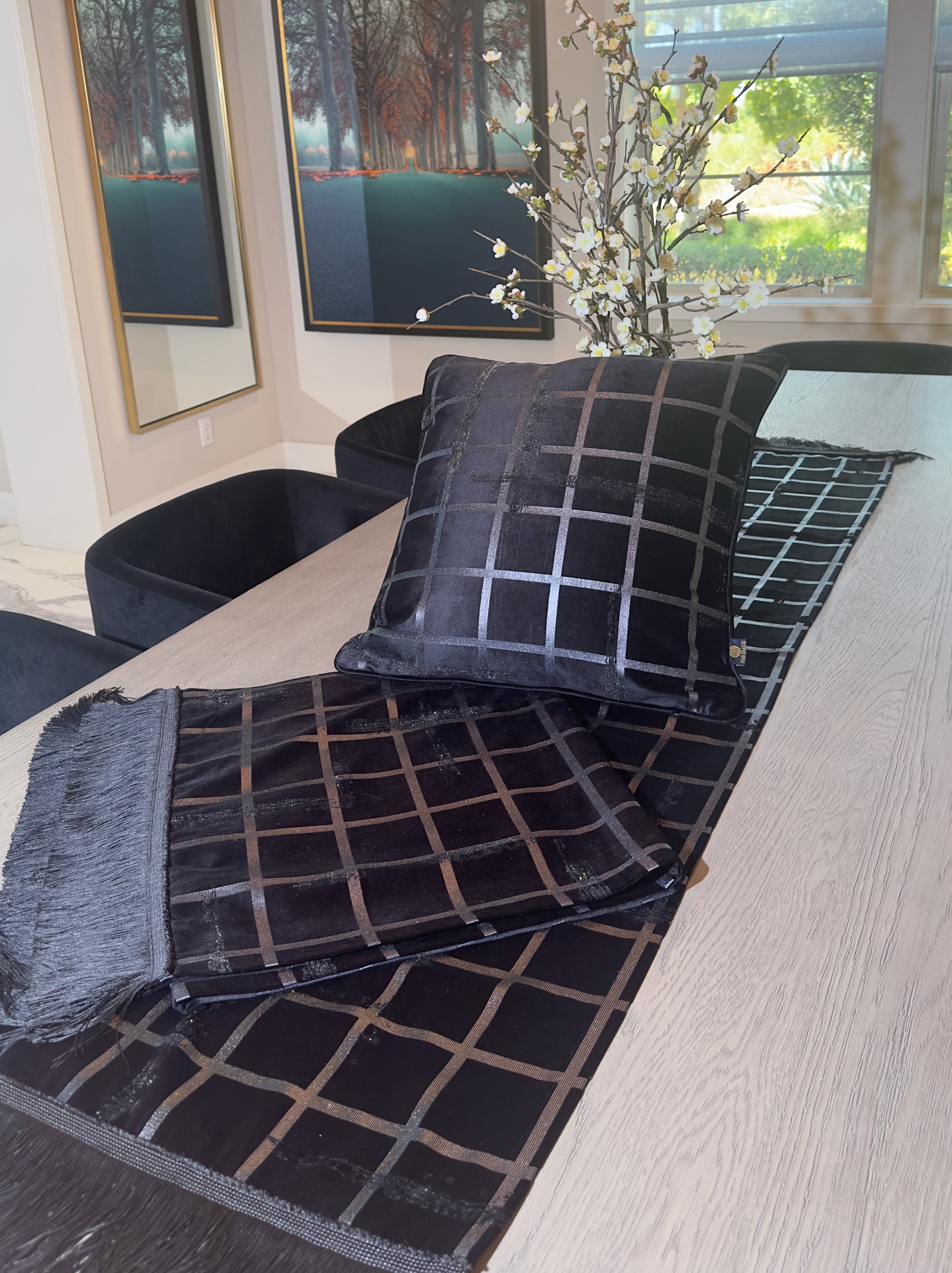 This pillow features a sleek black background adorned with elegant silver lines forming a crisp, geometric grid pattern. The minimalist design exudes modern sophistication, making it a perfect accent for adding a touch of contemporary elegance to any space.